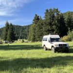 Da es in dieser Gegend keinen Camping gibt, machen wir uns auf die Suche nach einem Übernachtungsplatz. Nach Dimitsana folgen wir der 1243 in Richtung Karkalou. Von wo wir entlang der EO74 nach Vytina gelangen und dann ins Skigebiet der Region hinaufsteigen. Dichte Fichtenwälder säumen die Strasse. Sie scheinen gesund zu sein. Wir sehen selten einen ausgedörrten Baum. Auf der Suche nach einem Stellplatz testen wir diverse Waldwege, bis wir auf knapp 1500 m ü. M. den perfekten Standort in einer von Bäumen geschützten Wiese ausmachen.