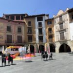 Wohltuenden Schatten an diesem heissen Tag spenden die weiten Arkaden entlang der kaum begangenen Calle Mayor. Ab und zu treffen wir auf ein fotogenes Gebäude. Doch insgesamt werden wir nicht warm mit Benabarre. Liegt es daran, dass wir die Stadt entvölkert erleben, die Läden mehrheitlich PP geschlossen sind – viele sind nur Fr-Mo geöffnet- und das Ortsbild durch die mit Autos zugestellten Plätze stark beeinträchtigt ist? Ein besonderes Merkmal sind auch die etwas abenteuerlichen elektrischen Installationen.